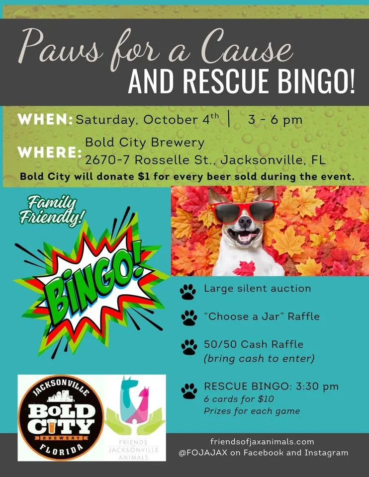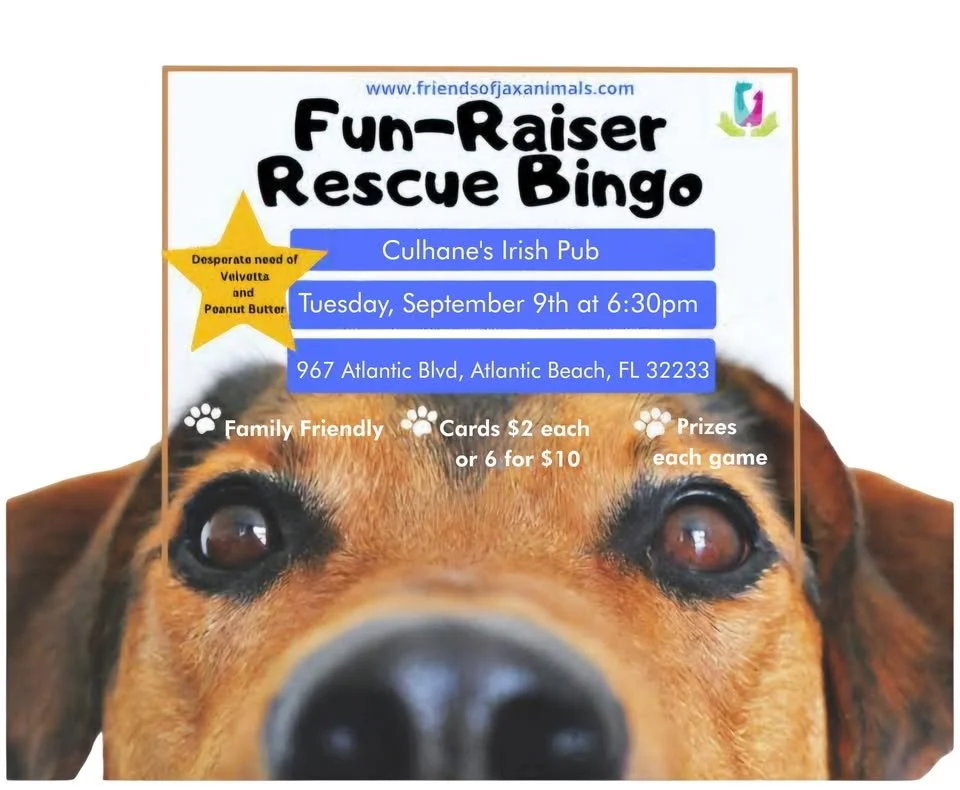Mark your calendars for an evening of excitement, laughter, and lifesaving impact at Fun-Raiser Rescue Bingo, hosted by Friends of Jacksonville Animals (FOJA)! Come out on Tuesday, September 9th at 6:30pm to Culhane’s Irish Pub (967 Atlantic Blvd, Atlantic Beach, FL 32233) and help us make a difference for Jacksonville’s homeless pets.