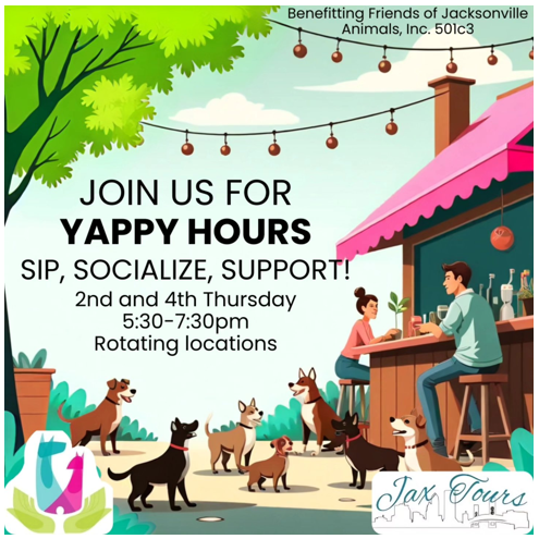 Bring your pup, grab a drink, and mingle with fellow animal lovers—all while helping us raise funds for the dogs and cats at Jacksonville’s city shelter. A portion of each yappy hour proceeds will be donated to FOJA!