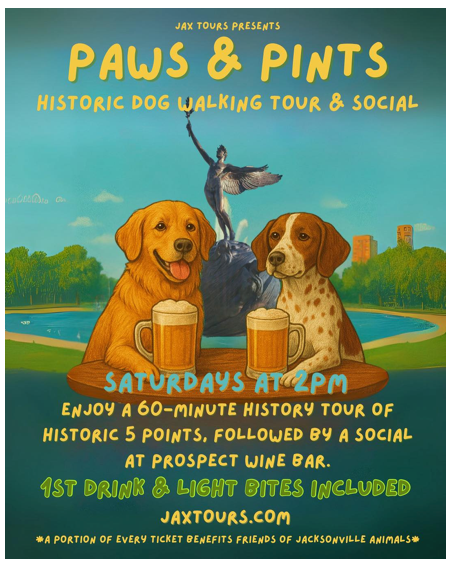 We’re thrilled to announce Paws & Pints—Jacksonville’s first dog-friendly history walking tour + social hour!