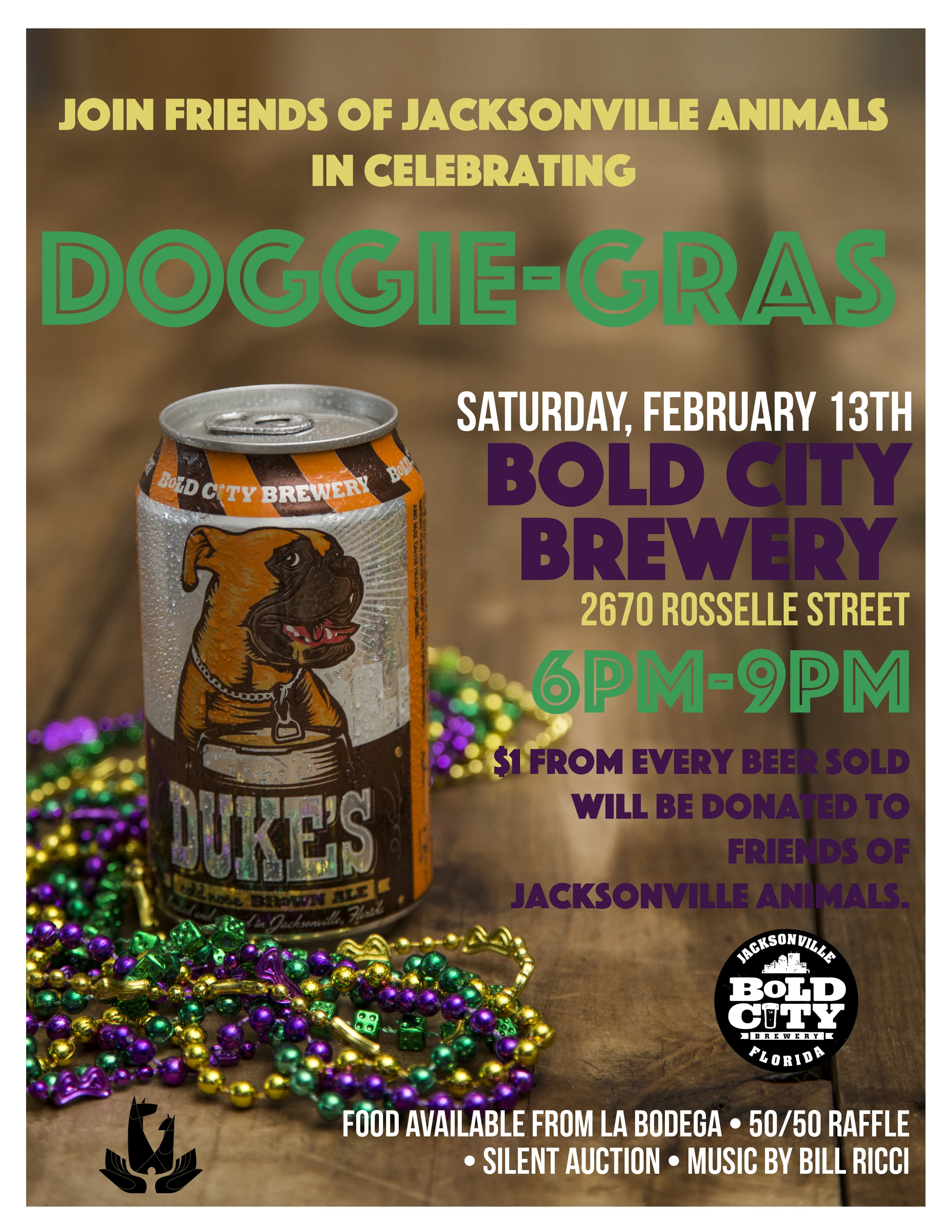 Doggie-Gras! Saturday, February 13, 2016 6:00 PM 9:00 PM Bold City Brewery 2670 Rosselle Street Jacksonville, FL 32204 (map) Google Calendar ICS Join Friends of Jacksonville Animals and Bold City Brewery for the second Doggie-Gras celebration with proceeds benefiting Friends of Jacksonville Animals!